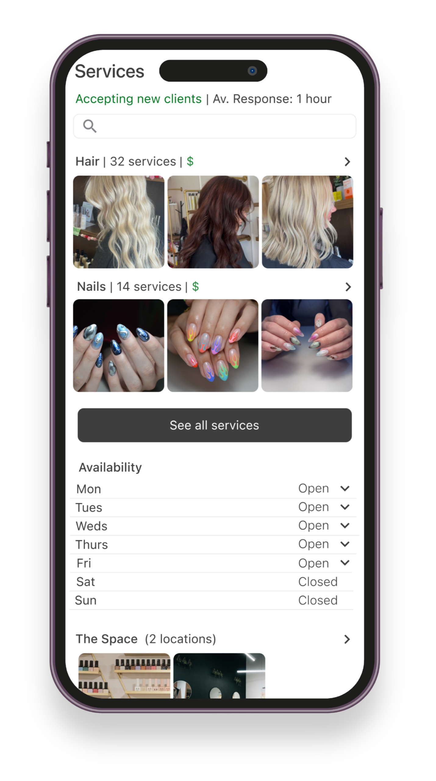 Beauty professionals post their portfolios on Grapevine and include all relevant details about their business and what clients can expect (don't worry, it's quick and intuitive). No more back and forth explaining your hours and policies.